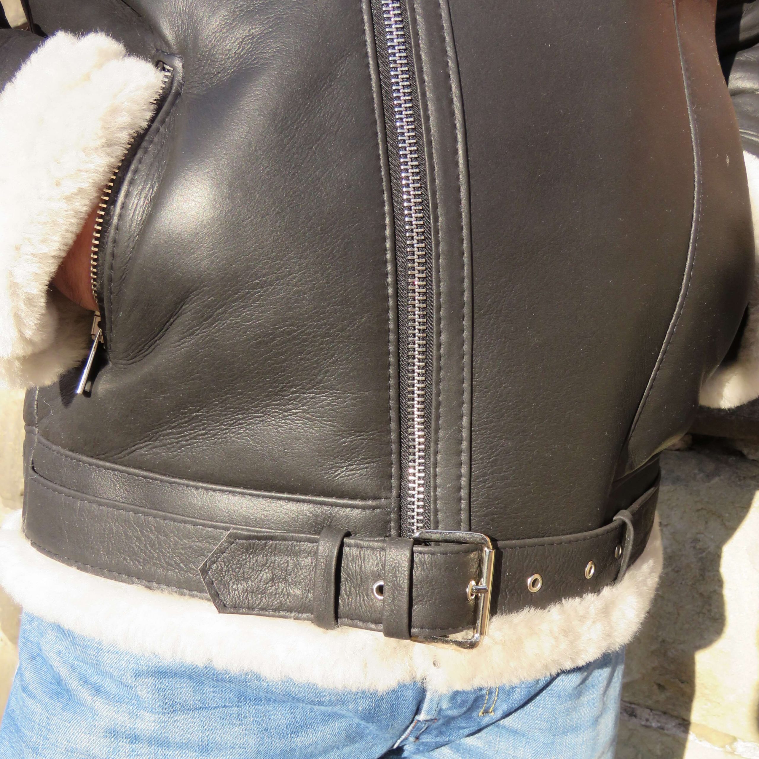Kożuch zapinany na zamek, na rękawach jako regulacja manszetu zamki, dołem pasek do regulacji w pasie.