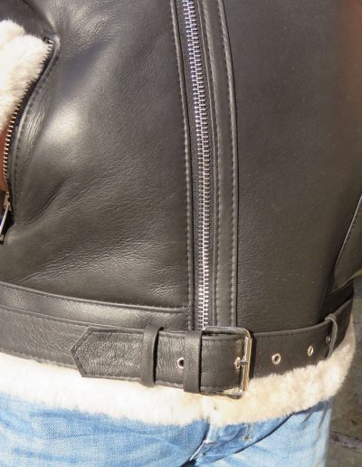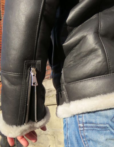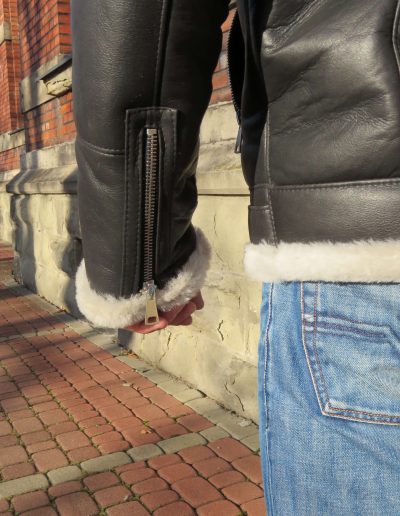 Kożuch zapinany na zamek, na rękawach jako regulacja manszetu zamki, dołem pasek do regulacji w pasie.